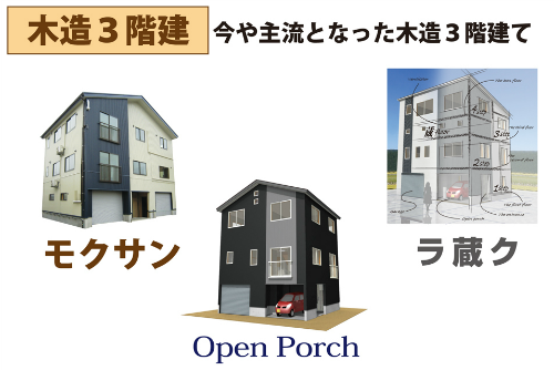 イシダホームは魚沼エリアでいち早く木造3階建てを主力に建ててきました。木造でも十分に強靭な家ができること、融雪技術が発展してきたこと、それらが木造3階建てをここまで普及させた要因です。「ビルトインスタイル」や使い勝手の良い「オープンポーチタイプ」、収納にこだわった「ラ蔵ク」など雪国仕様の生活しやすい家を完成させています。